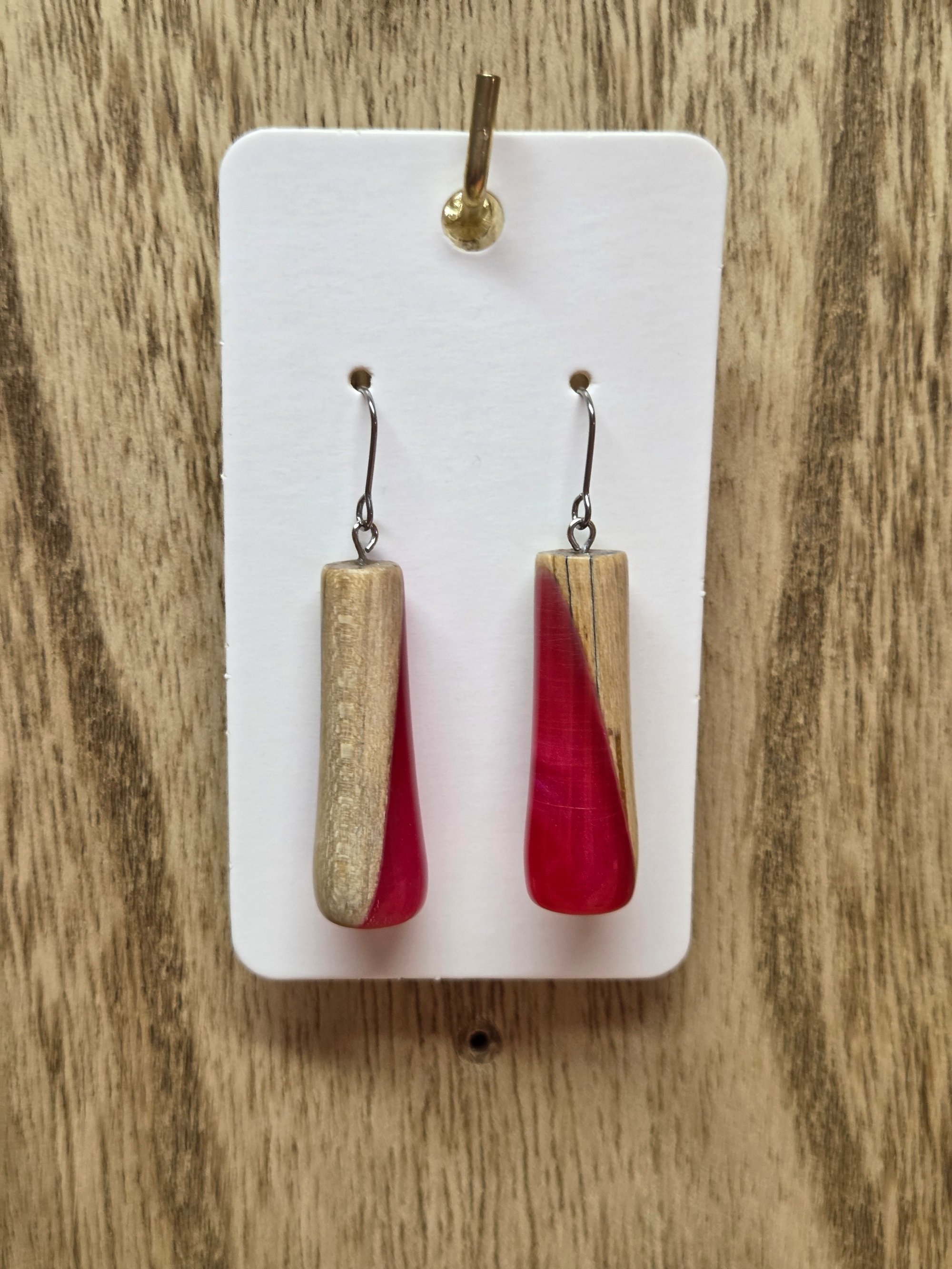 Stabilized wood and red resin long tear drop earring with titanium hypo-allergenic ear wires. Item is 1.5 inches long and weighs 2 grams.