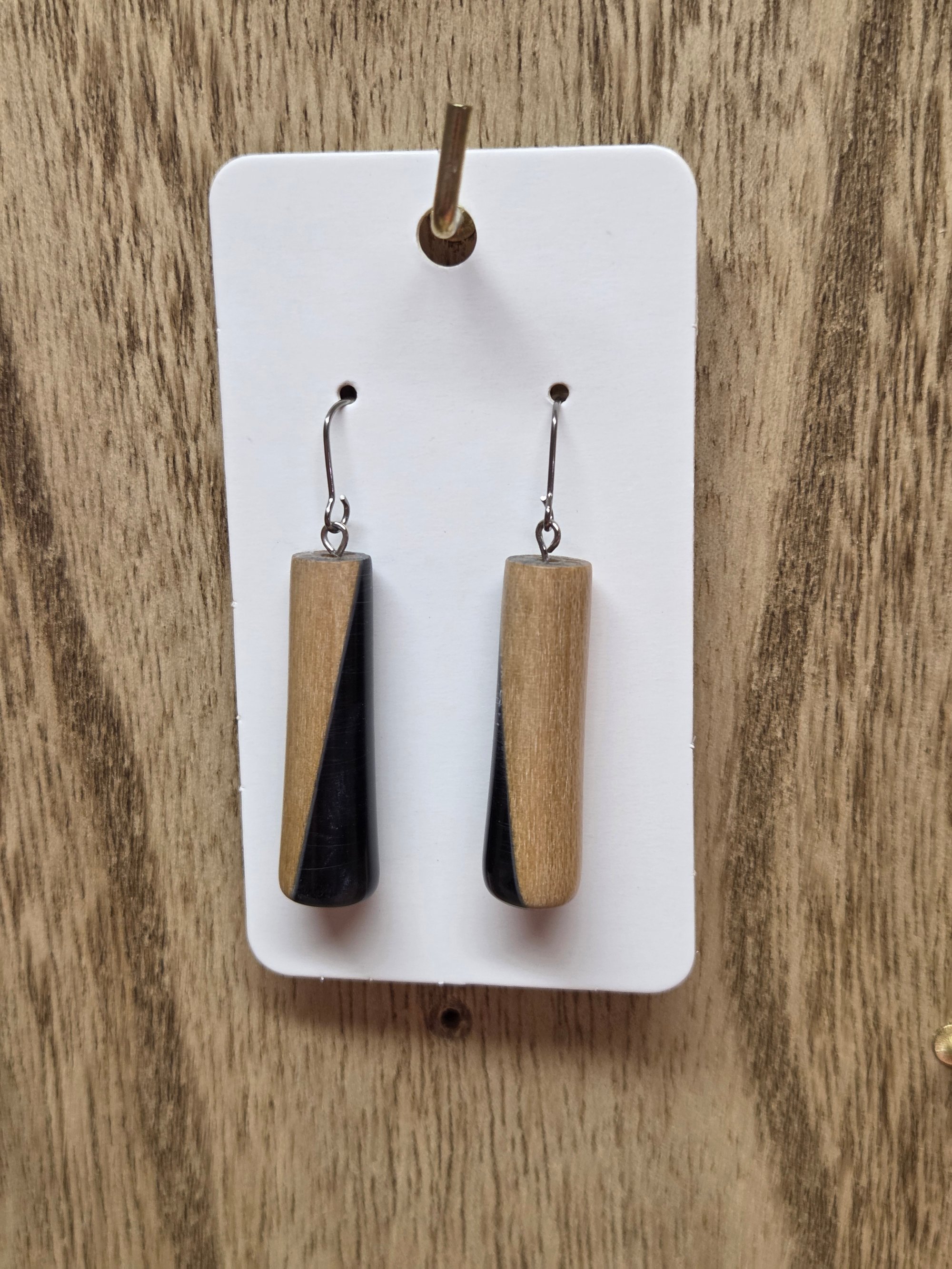 Stabilized wood and black resin long tear drop earring with titanium hypo-allergenic ear wires. Item is 1.5 inches long and weighs 2 grams.