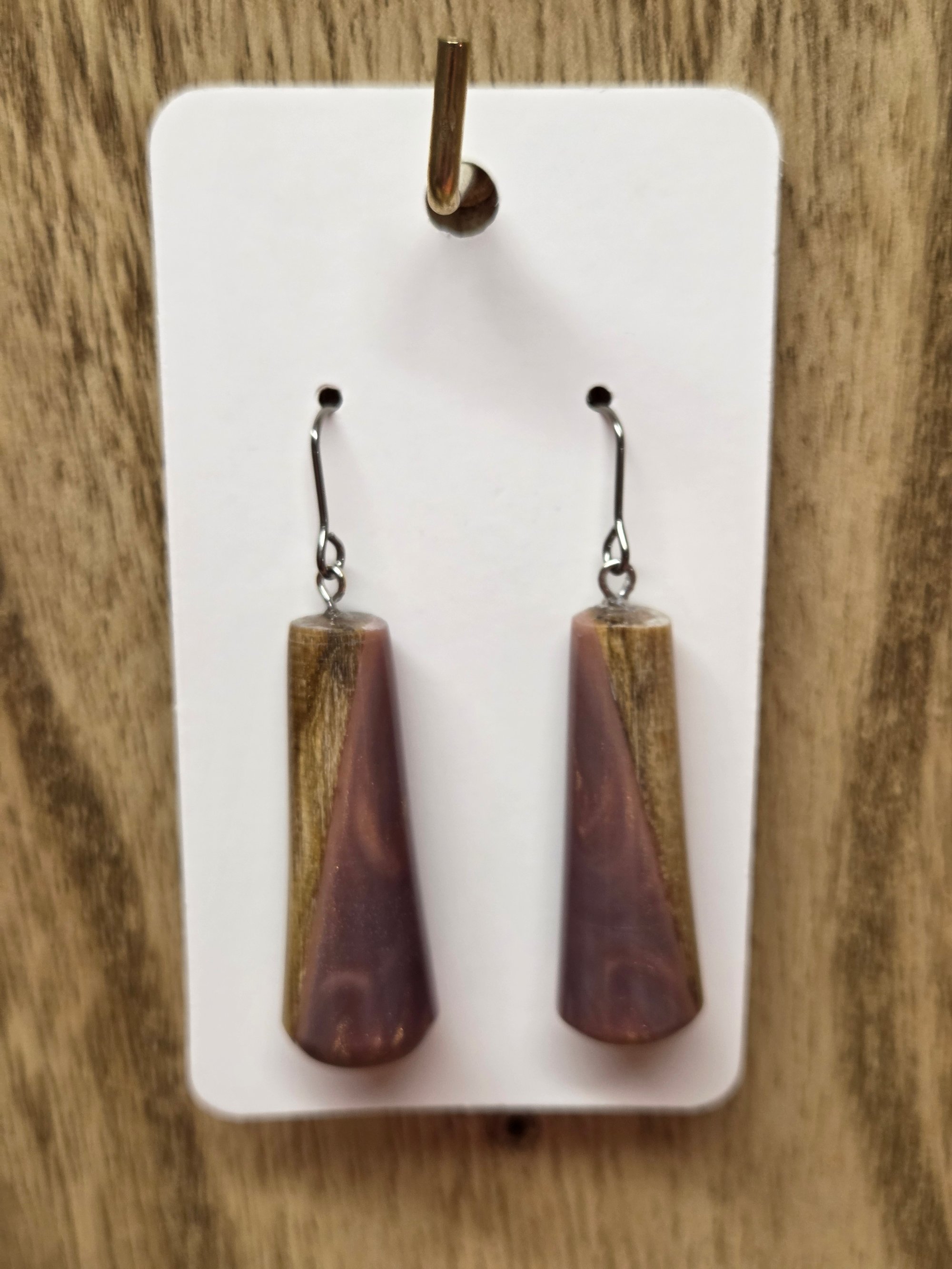 Stabilized wood and brass resin long tear drop earring with titanium hypo-allergenic ear wires. Item is 1.5 inches long and weighs 2 grams.