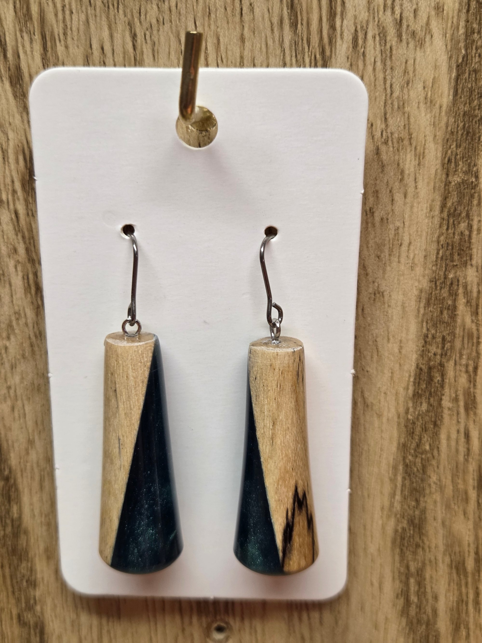 Stabilized wood and dark blue resin long tear drop earring with titanium hypo-allergenic ear wires. Item is 1.5 inches long and weighs 2 grams.