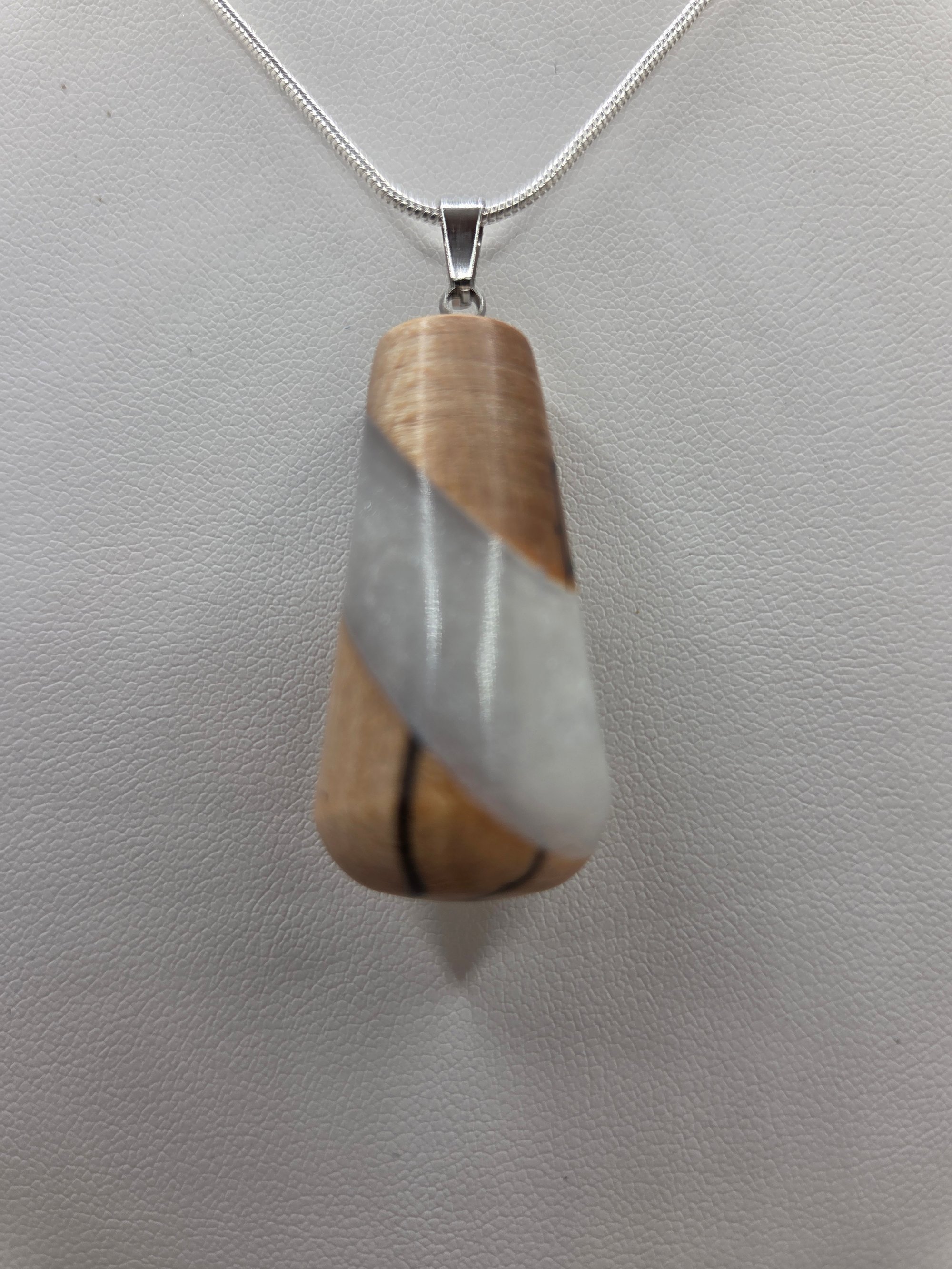 Stabilized wood and white pearl resin necklace with 18 inch silver plated stainless steel chain