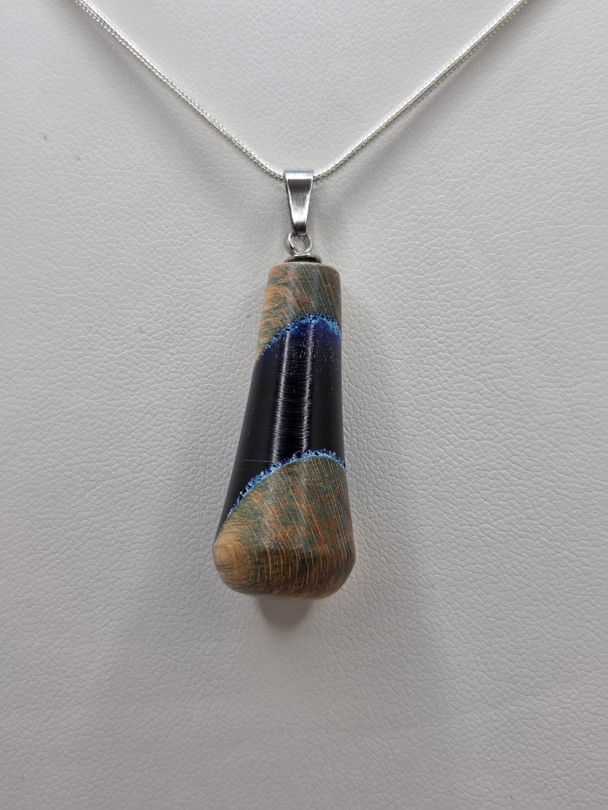 Stabilized wood and dark blue resin necklace with 18 inch silver plated stainless steel chain
